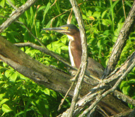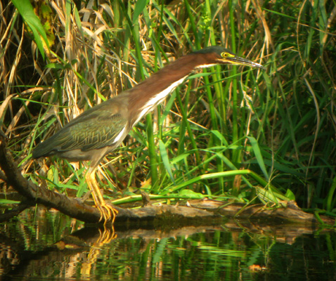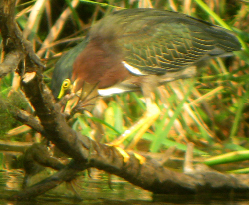 Green Heron with large bullfrog! The heron was almost completely submerged while grabbing this frog, then jumped back up onto the perch. The frog was released, maybe too large (or awkward?) for the heron to swallow.