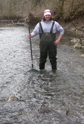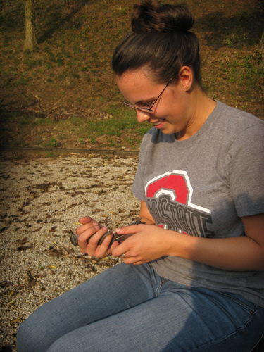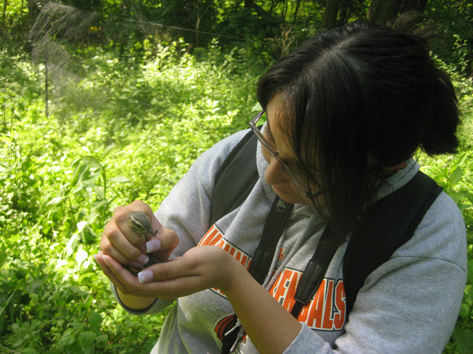 Heather inspecting a Gray Catbird (Dumetella carolinensis) for her 479 research project