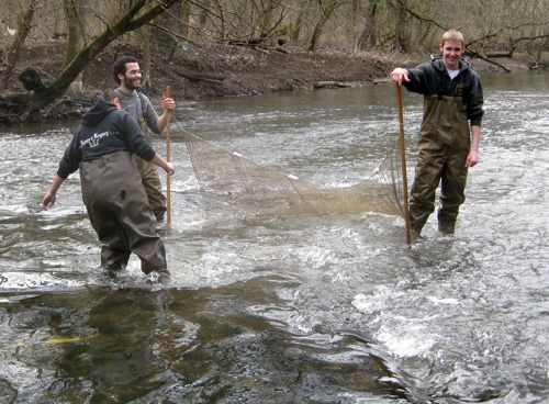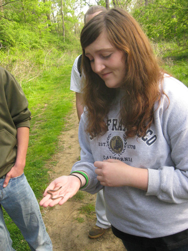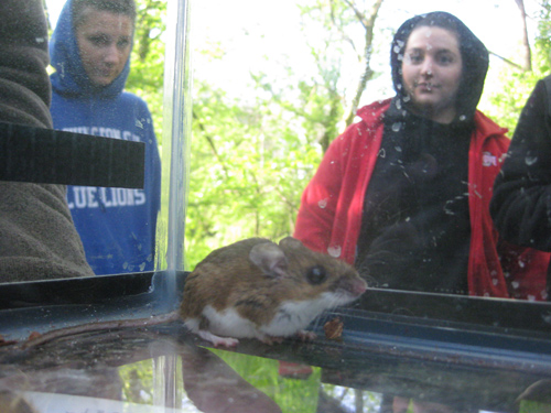 Ecology students watching a Peromyscus mouse during mammal trapping lab