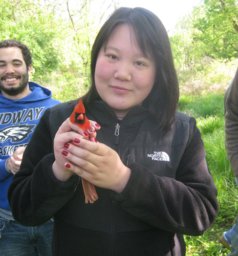 Jennifer holding a male Northern Cardinal (Cardinalis cardinalis)