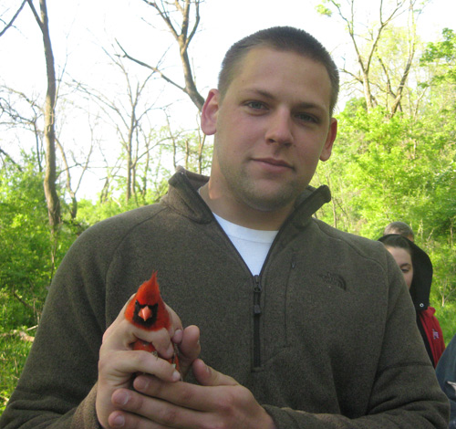 Tony holding a male Northern Cardinal (Cardinalis cardinalis)