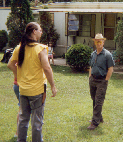 Hawk Spearman (L) and Bob Daigle at Hawk and Karen Spearman's residence on County Road 6 in Coshocton County. Hawk and Karen reported quite a bit of Bigfoot activity at their property in 1999.