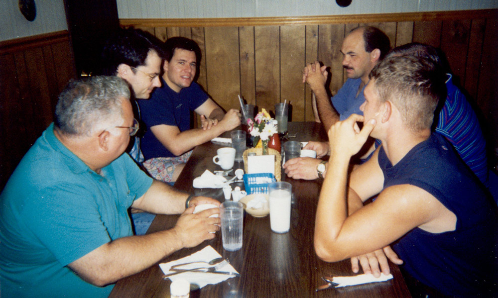 Left side, near to far: Art Caruso, Scott Herriott, and Marc DeWerth. Right side, near to far: Blake Mathys, Monte Ballard (mostly hidden), and Don Keating. This was taken before a monthly TSBSG meeting, while we were having a meal at April's Country Kitchen in Newcomerstown. We would often gather here for a meal before the meetings.
