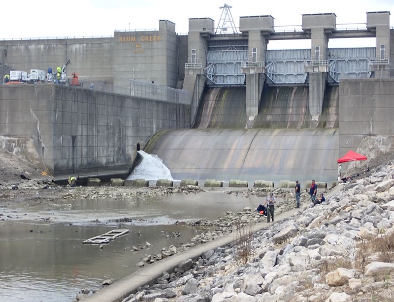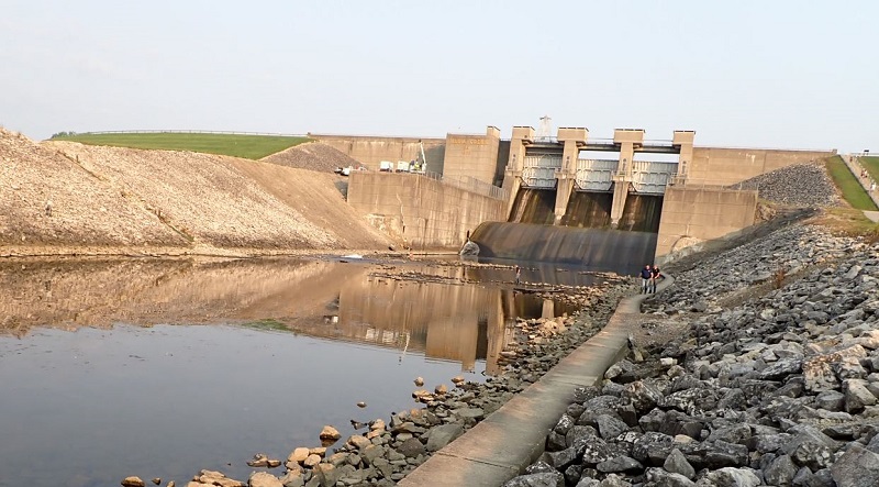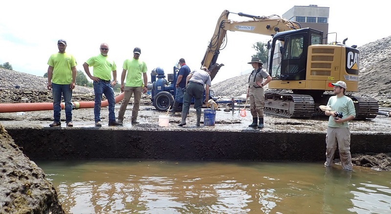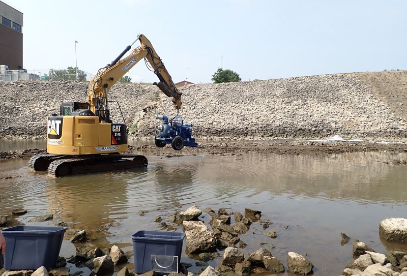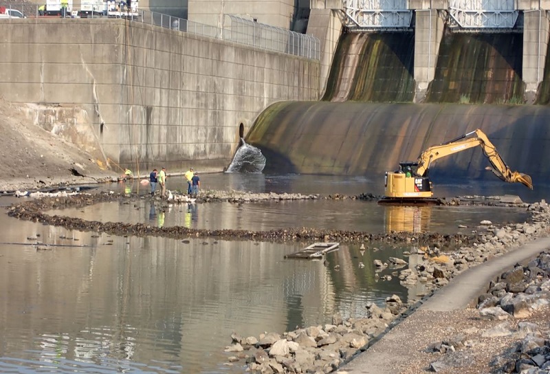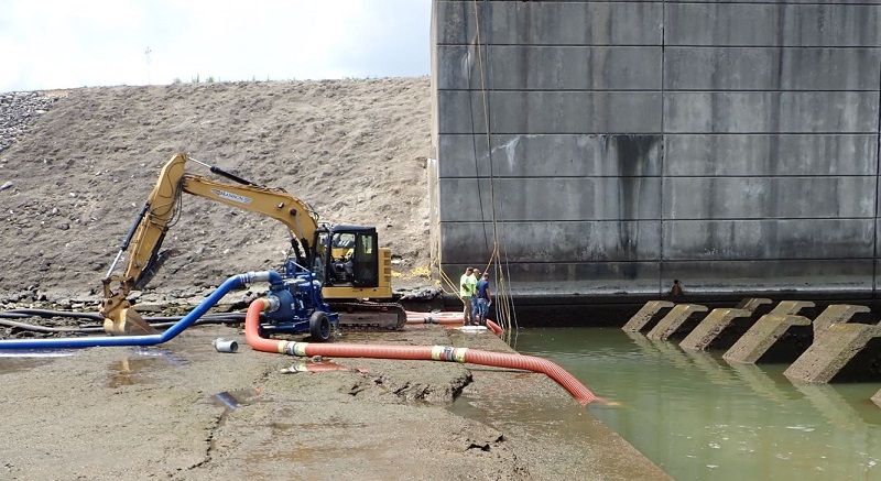 | Heavy equipment was used to create a temporary dam to prevent the water that was pumped out of the spillway from returning back upstream |
