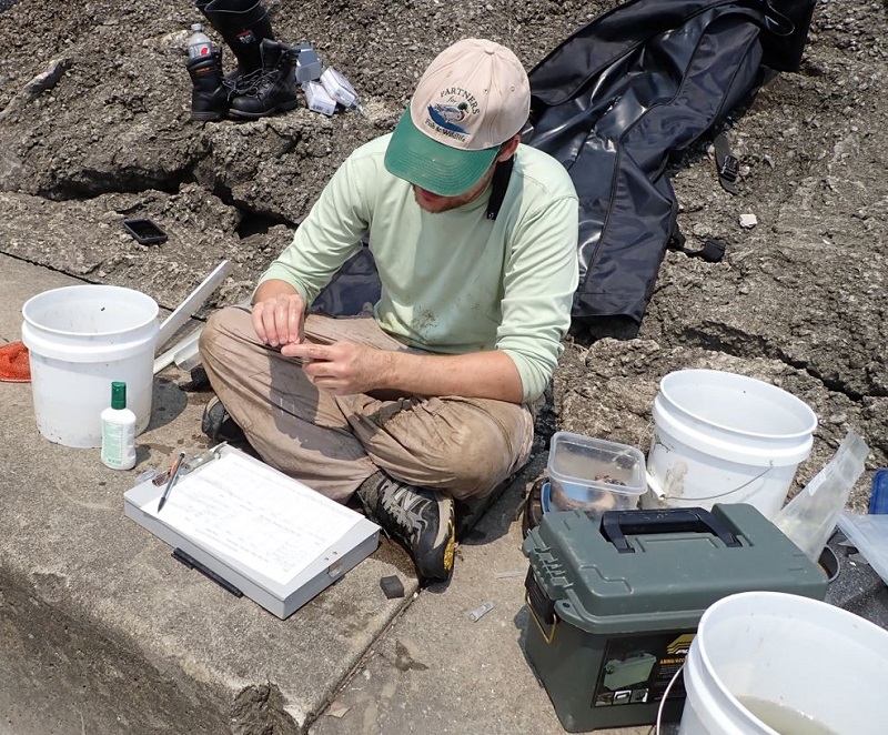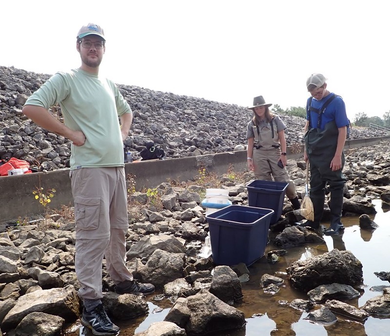 | Ryan Wagner (Left) and Kara Blomgren (center, from the U.S. Army Corps of Engineers). Before the water level was sufficiently lowered to look for mudpuppies, we caught a few other animals (shown in the next two pictures below) |
