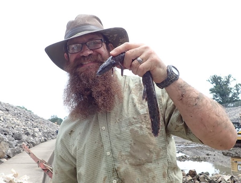 | Blake Mathys holding a mudpuppy (I had slipped and fallen in the mud, as can be seen in this picture) |