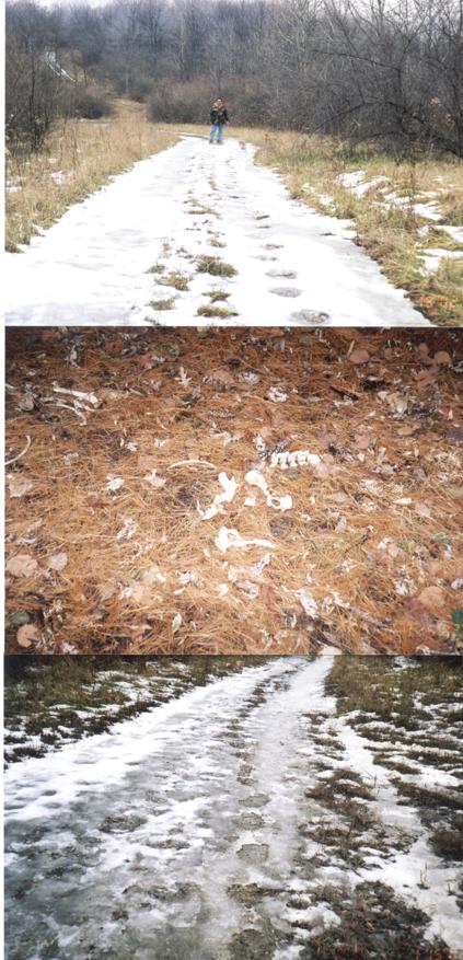 In the middle picture are canid skeletal remains found a few meters from the track-way