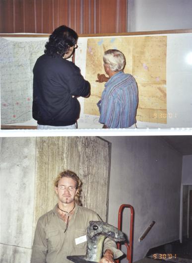 Bottom: Jason Walton holding Cadborosaurus sculpture